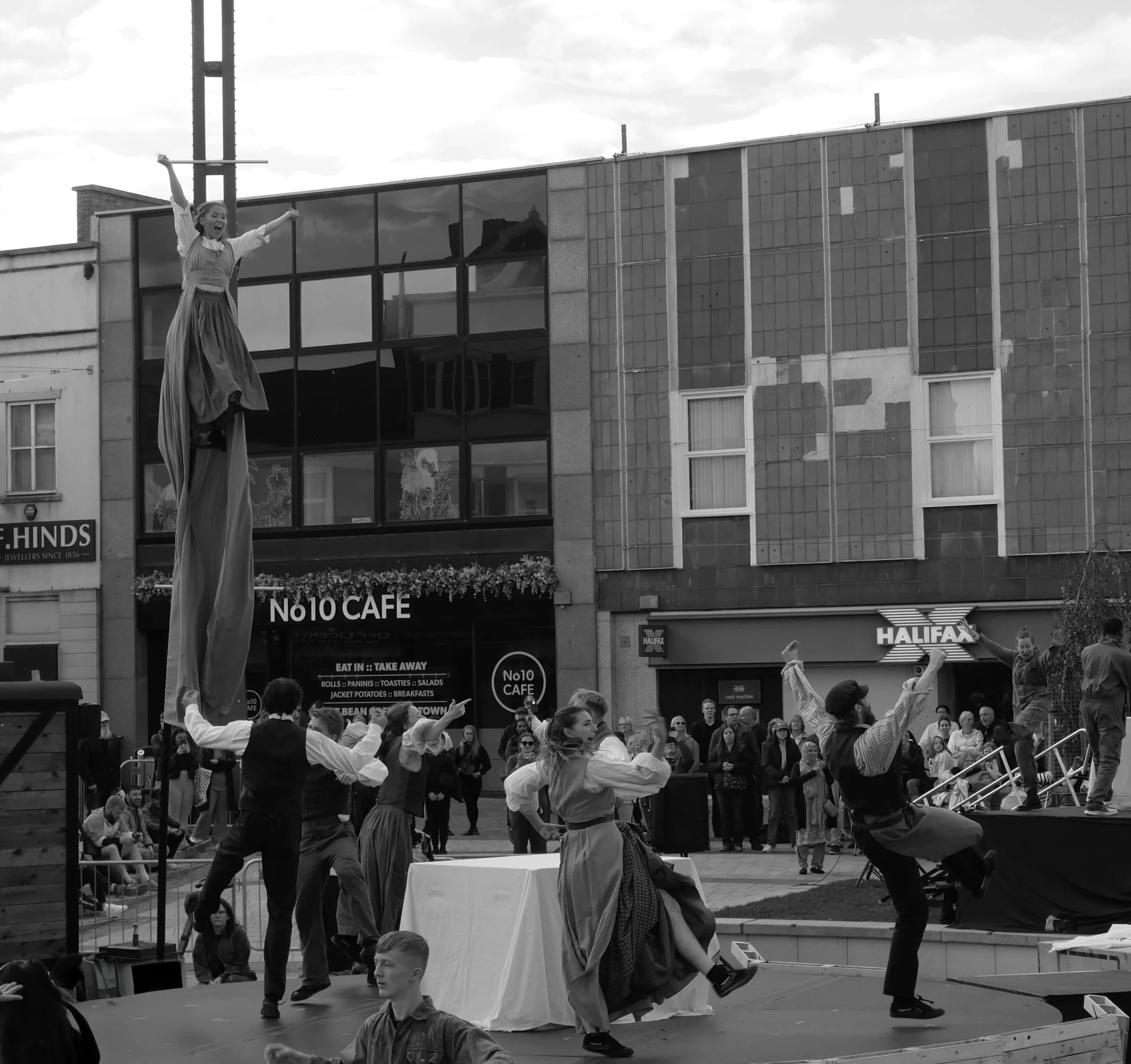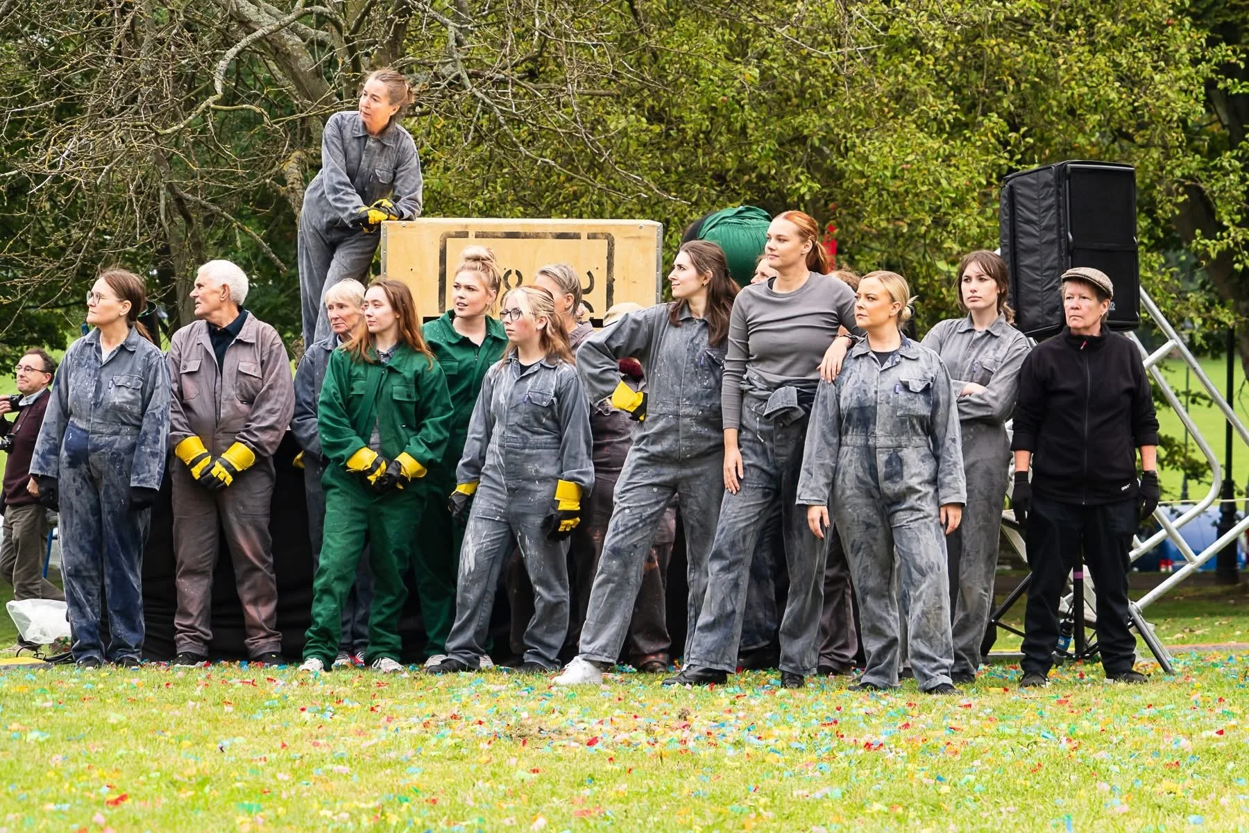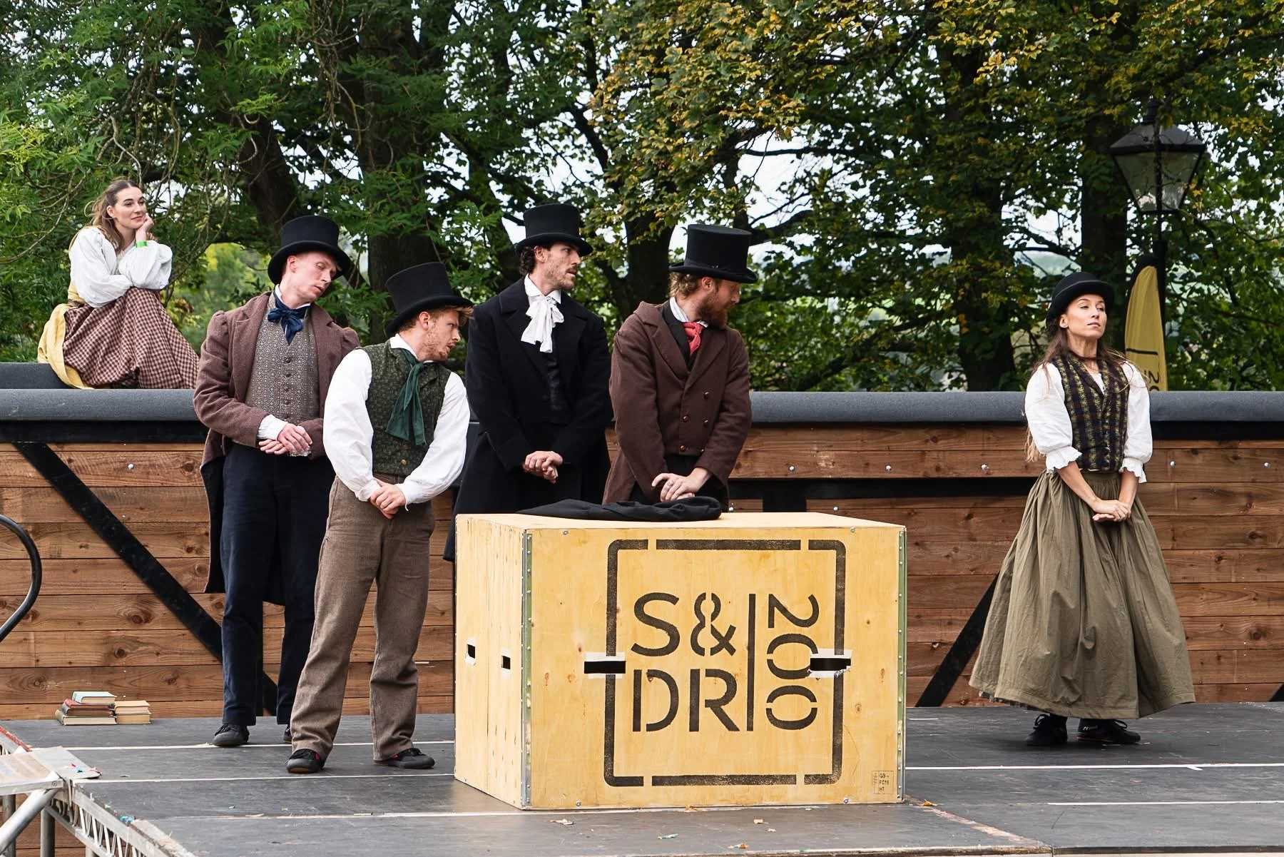 The production was performed twice on Stockton High Street, with the town’s iconic Stockton Flyer as a centrepiece, and again in Shildon’s Hackworth Park as part of the Anniversary Picnic celebrations. Across all performances, STEAM drew huge crowds and brought history vividly to life.